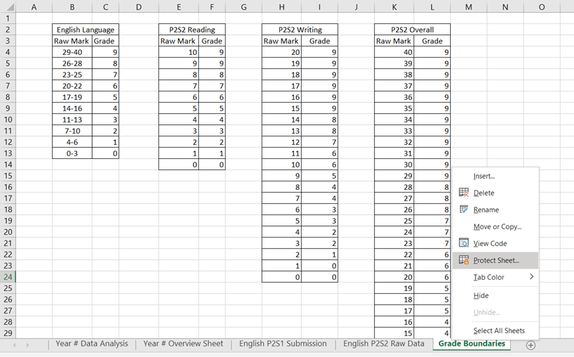 As you can see below, I created a ‘Grade Range’ table for each of the data drops with a separate row for each of the grades. This sits directly underneath the main body of the sheet so I can easily hide them later: