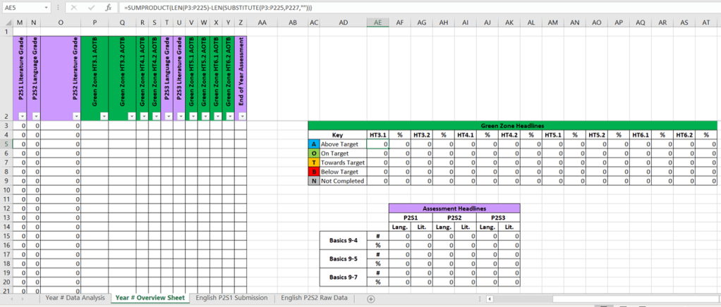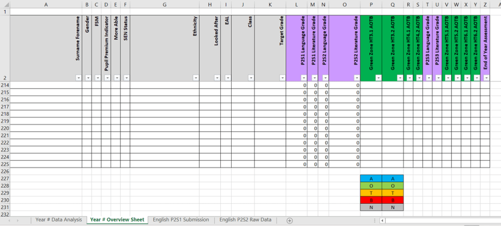 The first bit is easy, just write ‘A’, ‘O’, ‘T’, ‘B’, ‘N’ in separate cells somewhere on your sheet, personally I prefer to do mine underneath the main body of the sheet just above the ‘Grade Range’ tables: