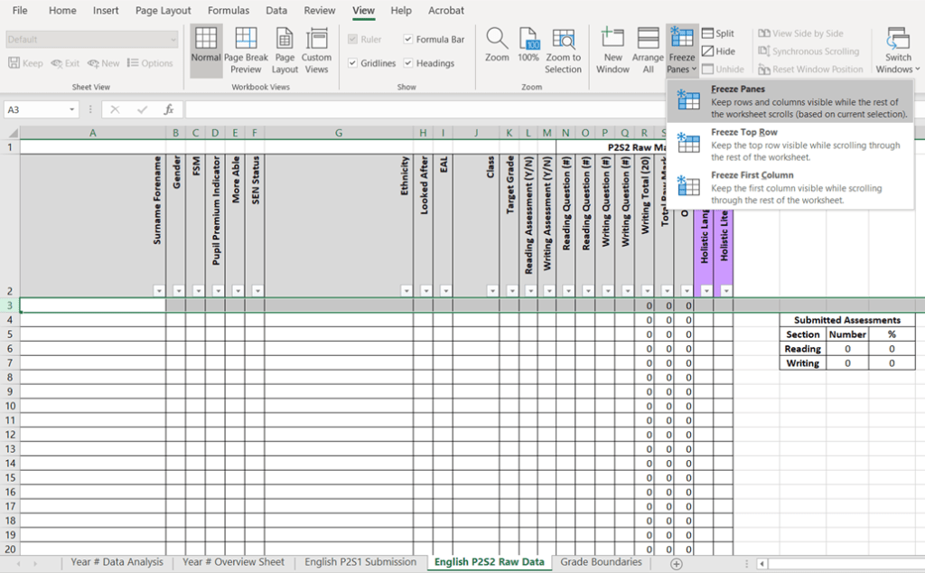 Isn’t it annoying when you’re trying to find information for a kid but by time you get to the bottom of the sheet and find their name you lose all of the headings so that line of numbers mean absolutely nothing? Well, don’t fret. We can simply freeze the pane: