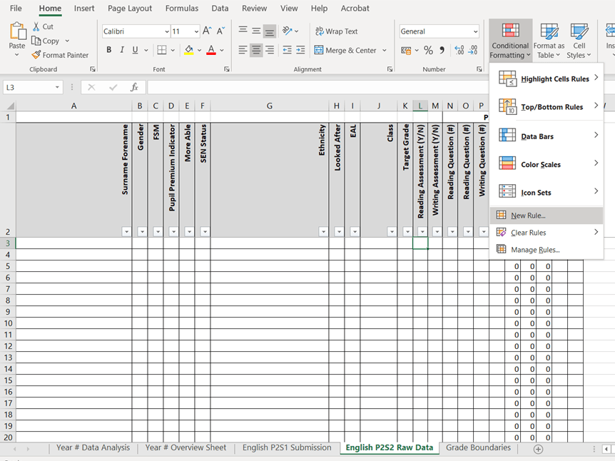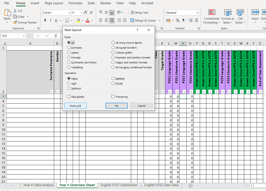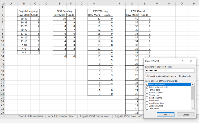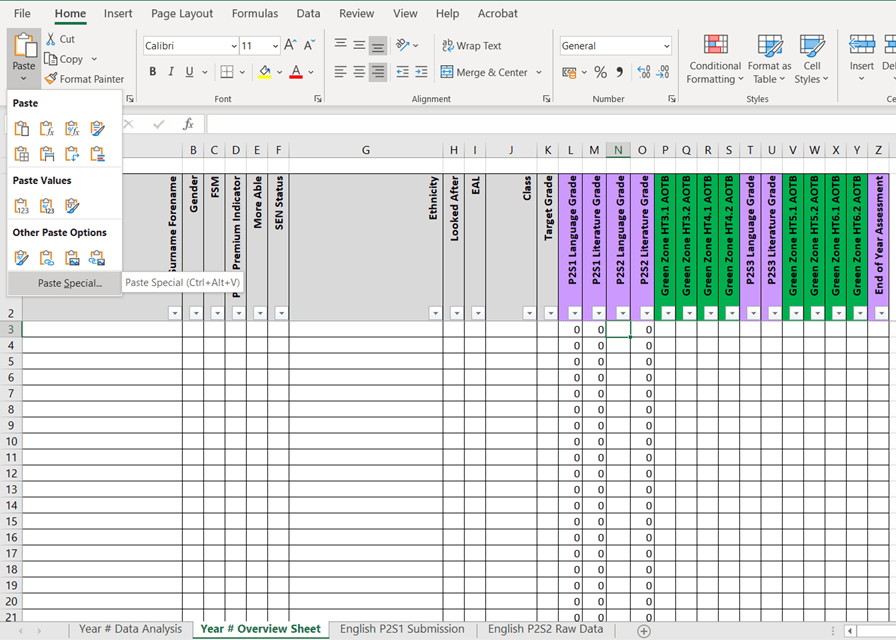 Notice how my Formula Bar now reads ‘=’English P2S2 Raw Data’!T5 which is the name of the sheet and cell I have copied the data from.