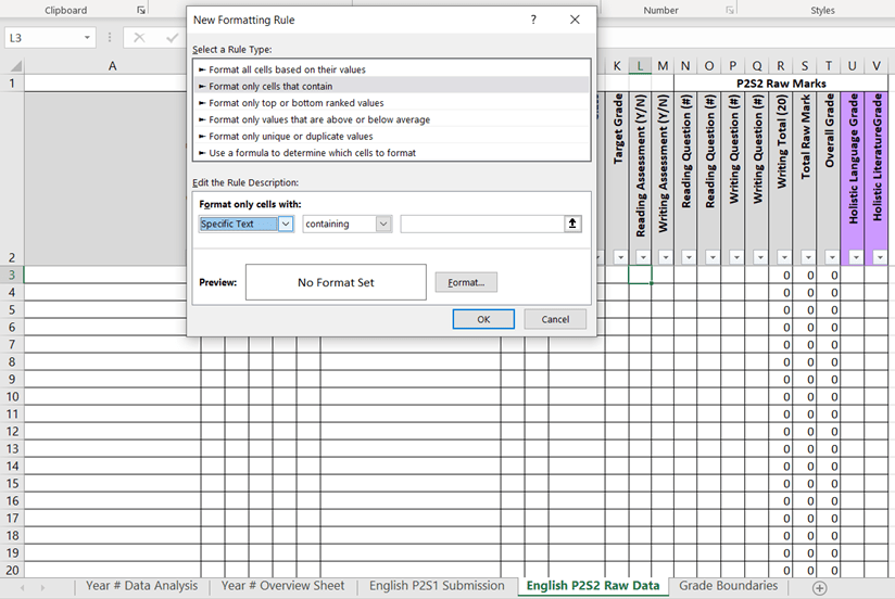 In this instance the S3 is the cell that the formula will find the raw data and the ‘P2S2_40’ is the name of my table from the grade boundaries (Step One). Everything else stays the same.