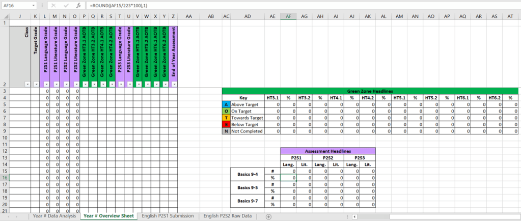 This is where you want something from one sheet to appear on another and update itself automatically. For example, raw data or grades from an assessment point to appear on the Overview sheet, so it is all in one place:
