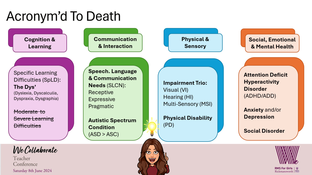 In the realm of SEND we live precariously on the edge of the importance of identification and the fragility of labelling. Whilst it gives us a way to start the conversation of support with those not versed in the art of acronym, it can also acts as a barrier to meaningful conversation.