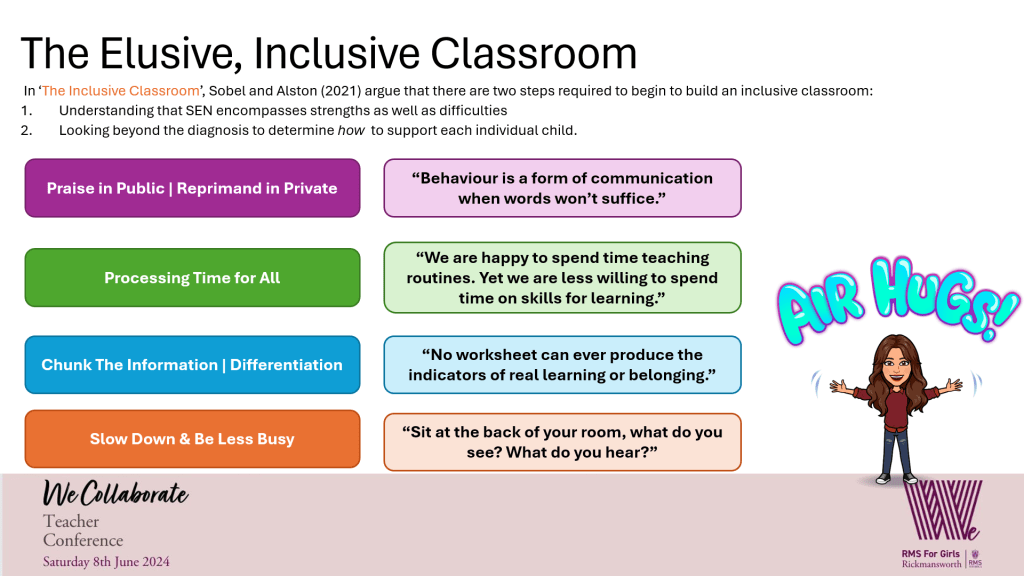 Inclusivity does not mean being overtly energetic, fluffy round the edges and eager to give air hugs. Inclusivity is about looking beyond the label and considering the needs and strengths of all children.