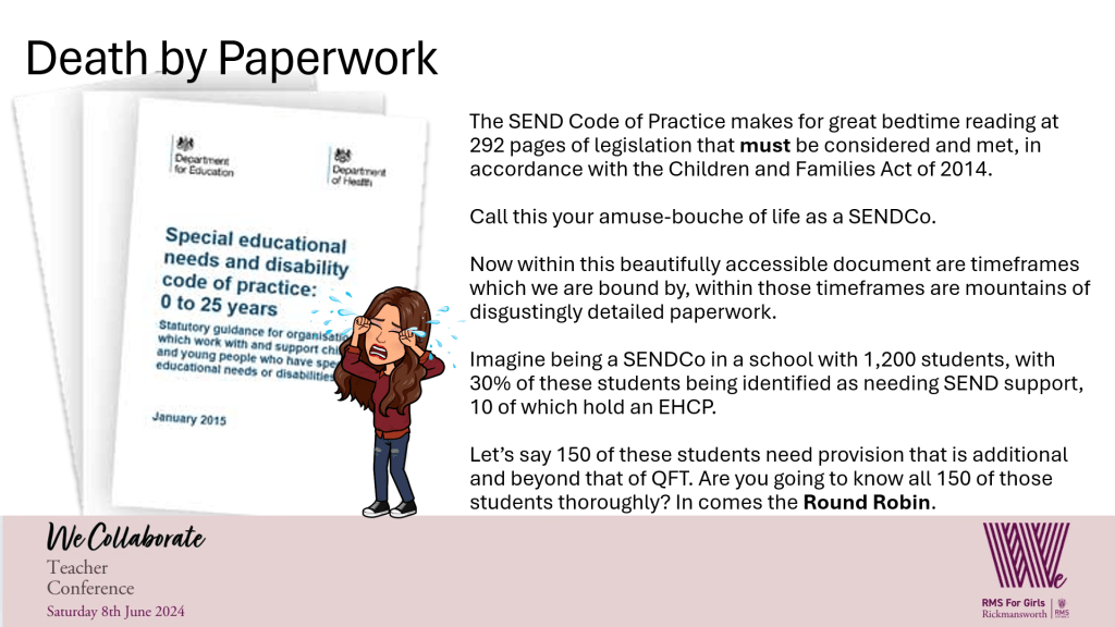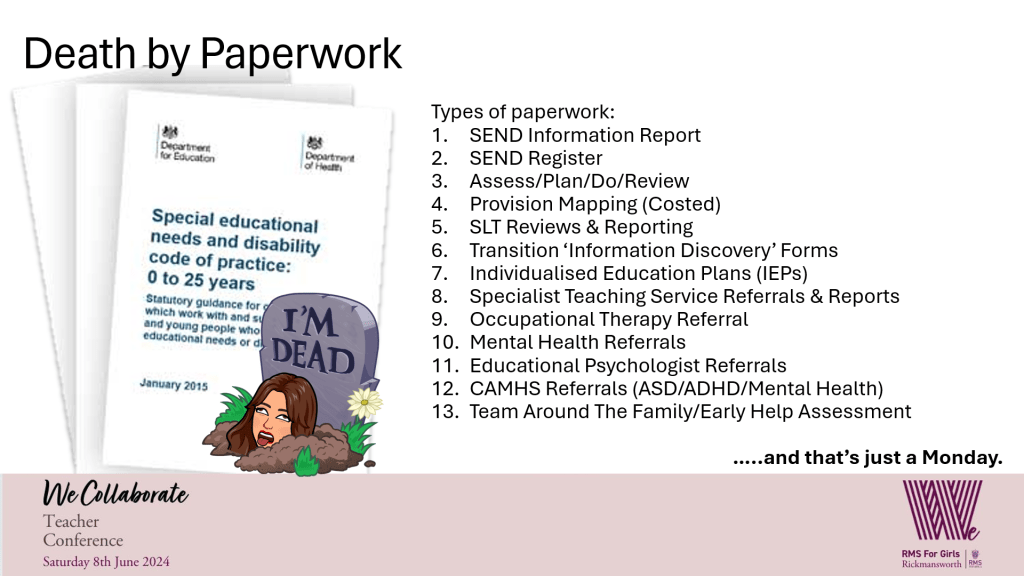 A cautionary tale for you, young warrior, this is just the surface of the paperwork that a SENDCo must complete, review and adjust on a regular basis. Each aspect of the paperwork above requires the SENDCo to know the ‘admin’ information (name, DOB, address, parental consent), as well as their progress (attendance, behaviour, academic attainment, round robin) and their background (family history, primary school information, mental health needs), as well as the intricacies of their SEND identification.