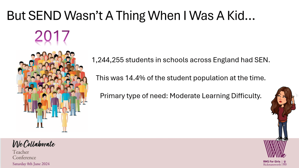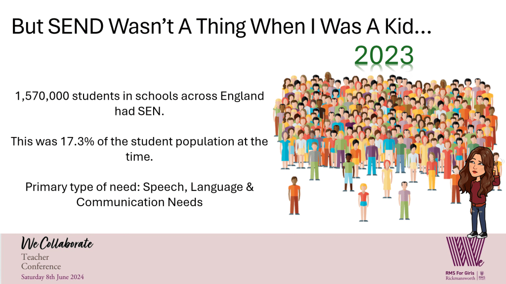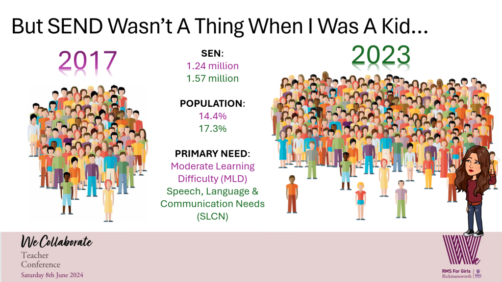 The mythical age of 2017 became the whispers of legends, with the dawn of 2023, bursting into the tale with 1.57 millions students in schools across England being identified as having SEN. In just six years, the figures had stretched across caverns, almost measureless to man (one for my English lot), by a 2.9% increase.